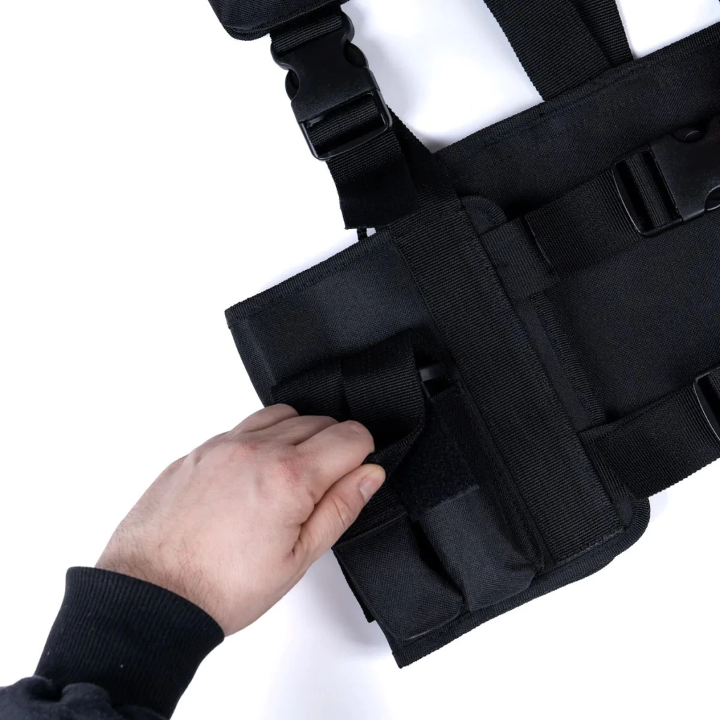 Este modelo incluye múltiples porta elementos estratégicamente distribuidos, pensados para facilitar el acceso rápido al equipamiento esencial. Incorpora una funda porta arma, porta esposas, dos fundas para cargadores 9mm, porta cartuchos para 10 unidades, porta handy y un porta objetos trasero de gran capacidad (20 x 22 cm). Cada compartimento está confeccionado con la misma resistencia que el chaleco para soportar el peso y el uso cotidiano.